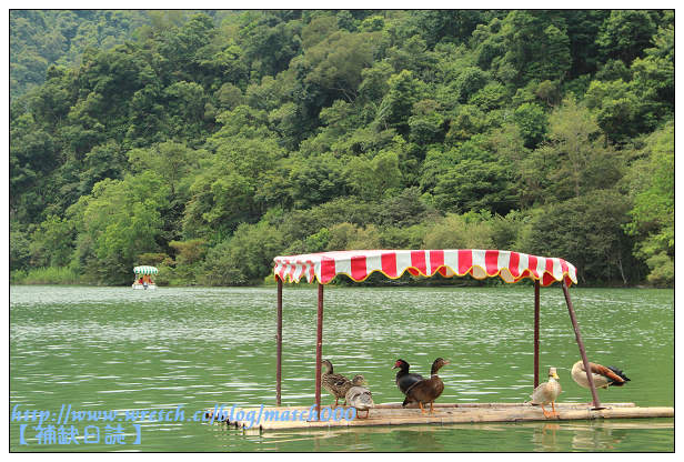 在湖面會看到一個敞篷竹筏,會看到不少鴨鴨停在上面休息。