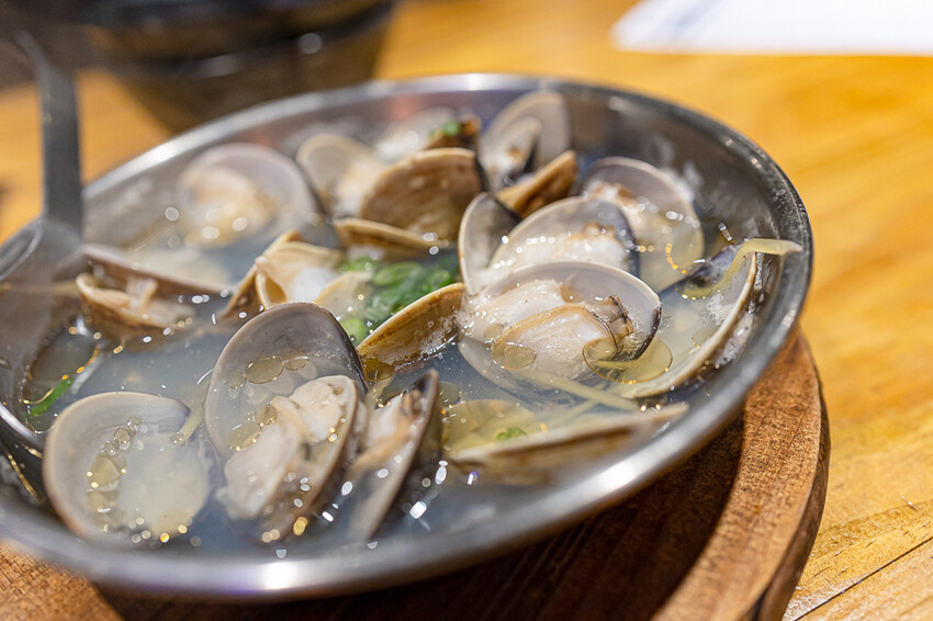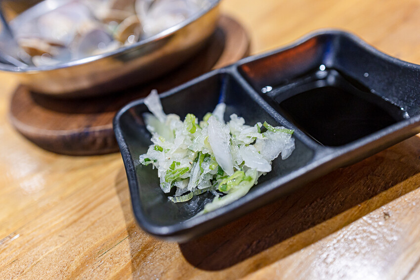 每桌會招待一份很棒的蛤蛤鍋,用一點清酒、薑絲清蒸,再灑些香油提出蛤蜊的鮮味,每顆蛤都很肥美又新鮮,這湯頭喝起來好喝極了!