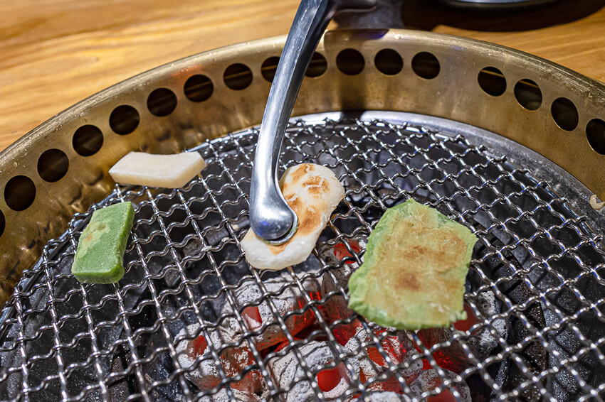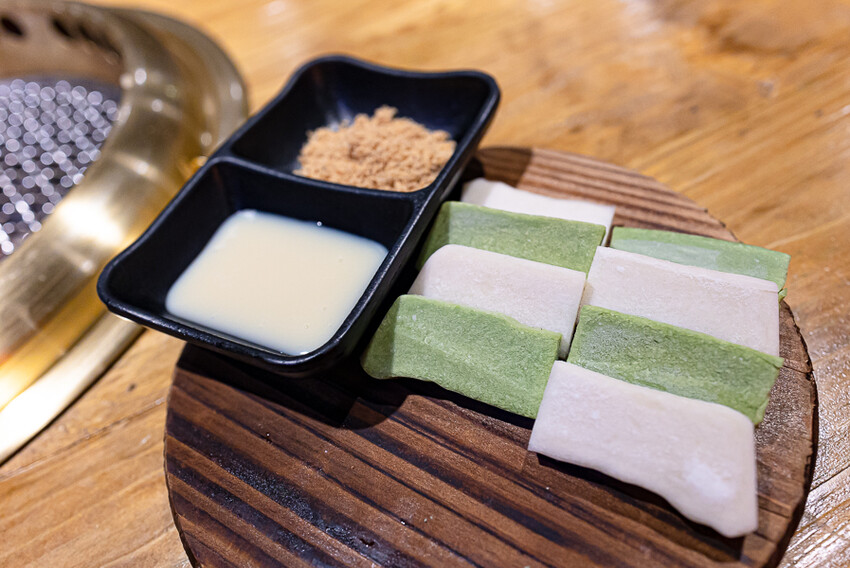 麻糬有兩種口味分別是原味跟抹茶,可以點上綜合一次就可吃到兩種口味,另外也有兩種烤法,一種是比較鬆軟的QQ烤法,另一種則是脆如餅乾的酥脆烤法,喜歡哪一種的都可以請店員幫烤。沾上點煉乳及花生粉,最後的結束就在這炭火燒肉才比較吃得到的炭火烤麻糬中劃下結尾。