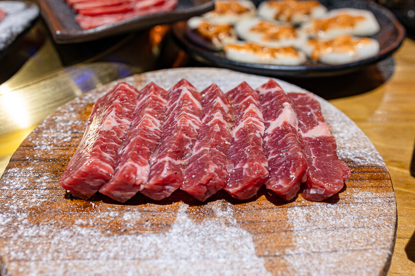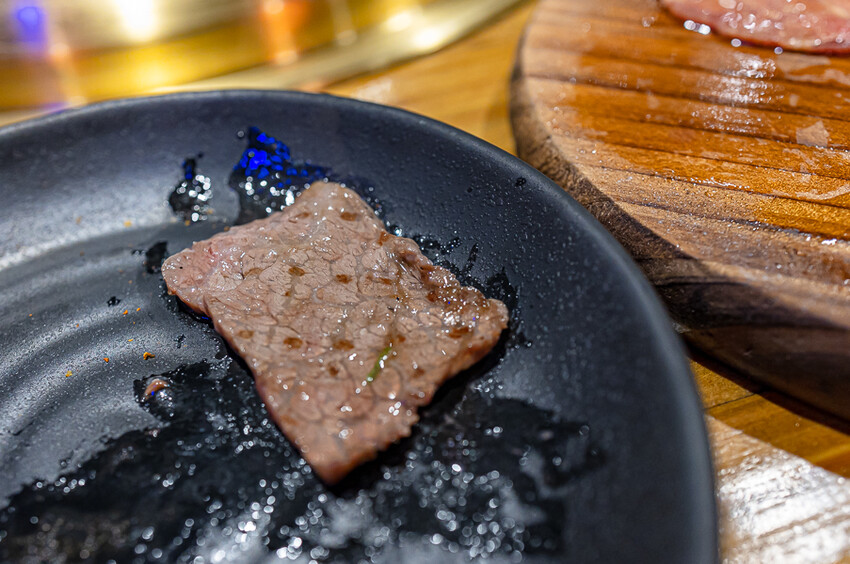 要論今天用餐的CP值,那我會投票給這一份牛肋條,帶點微筋,不過不會硬到咬不爛,肉質則是充滿油花,是個越嚼越香的品項,如果今天小資用餐,那必點這道牛肋條,少少的錢就可以吃到濃厚油花多的香氣,建議烤到有點七分熟,讓表皮有點金黃微焦又會更增加點焦香氣味。