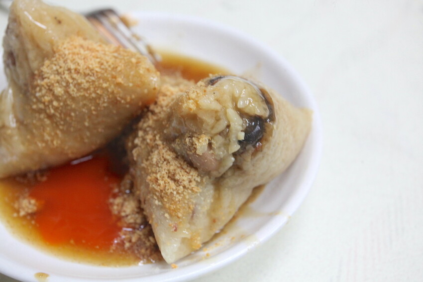 這盤肉粽和菜粽兩樣粽子大小一樣大,粽子有淋上自製醬油膏及灑上花生粉,但沒有添加香菜和蒜泥來提味。