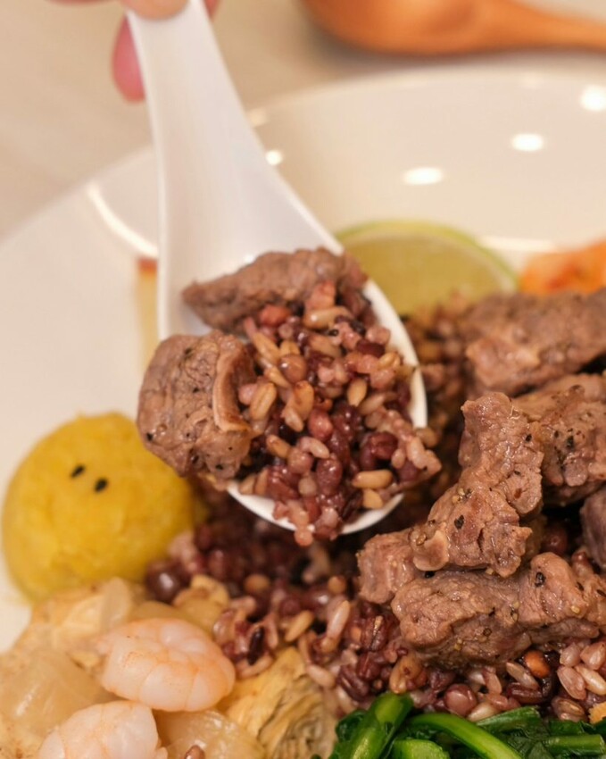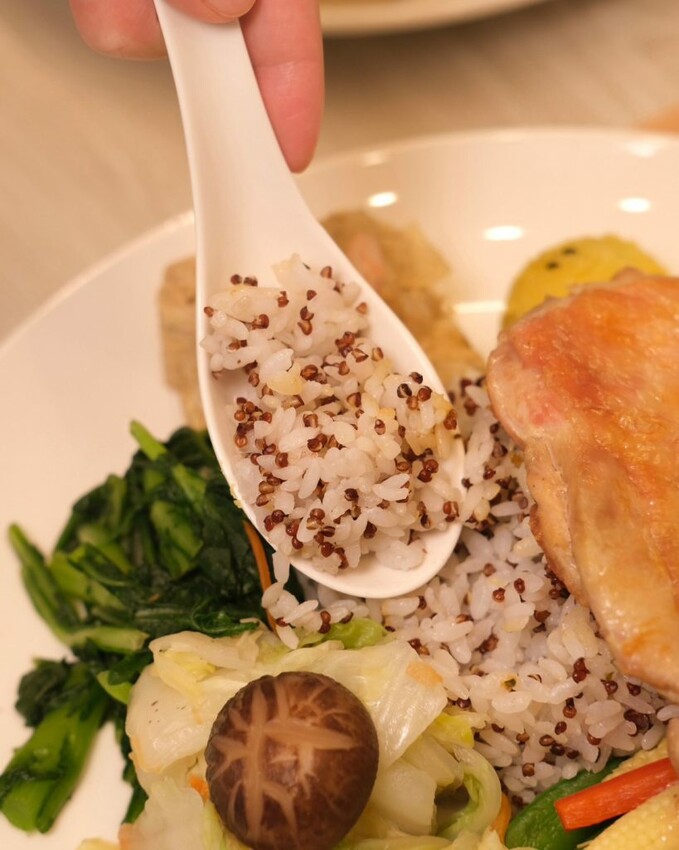 ▼米飯提供五穀飯和紅藜麥兩款選擇,光用聞的就覺得香噴噴,吃起來更是粒粒分明,最棒的是都不用額外再加價。