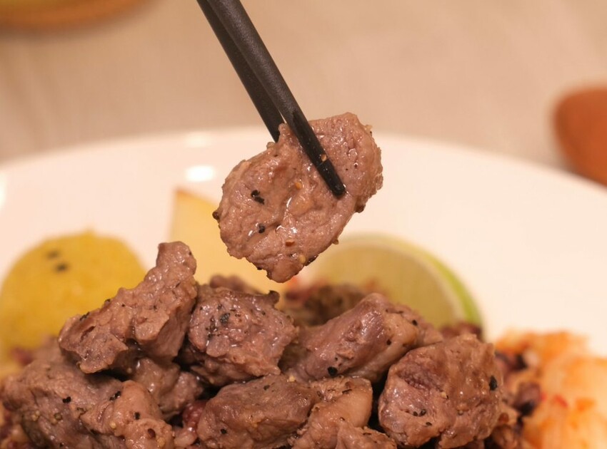 ▼骰子牛選用美國CHOICE等級的牛肉, 肉質紮實咬起來柔軟多汁,淡淡的調味更凸顯牛肉香氣,相當好咀嚼入口,配菜部分也是相當營養繽紛,尤其喜歡豆皮蝦仁滑嫩的口感,還有胡麻沙拉的爽脆多汁,整份吃完真的相當有飽足感。
