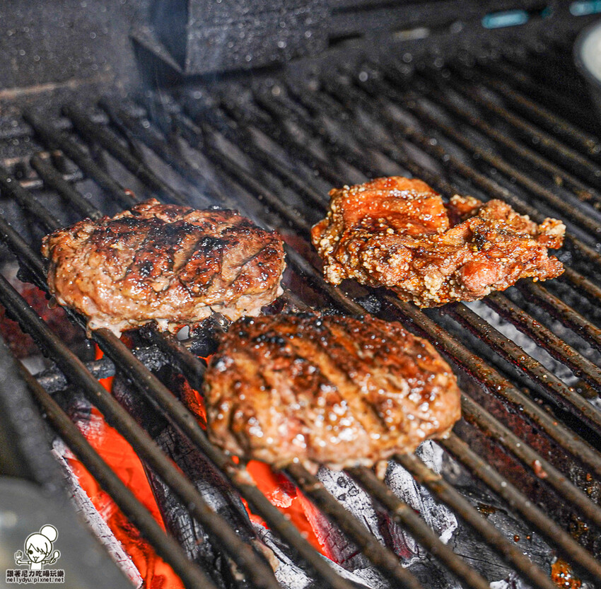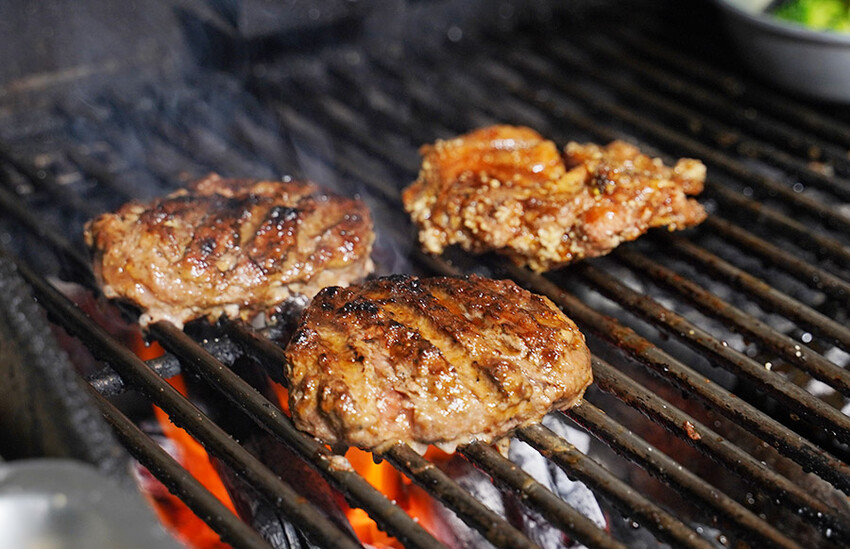 透過炭火炙熱讓主食肉排可以鎖住水嫩、讓表面帶出焦香氣味