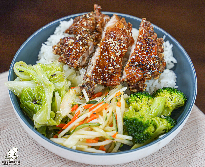 搭配三樣配菜,米飯使用壽司米飽滿香甜好吃份量也很足