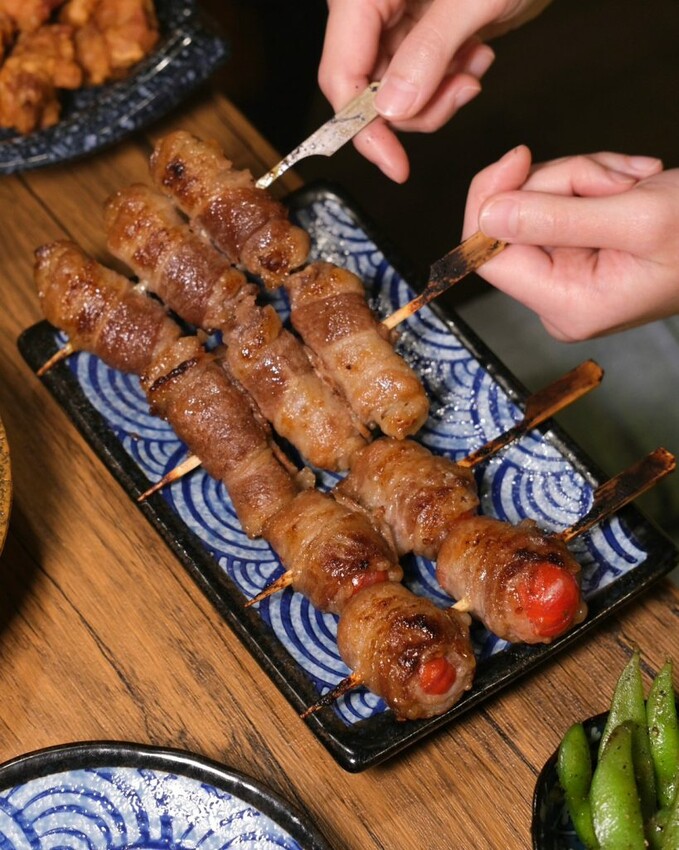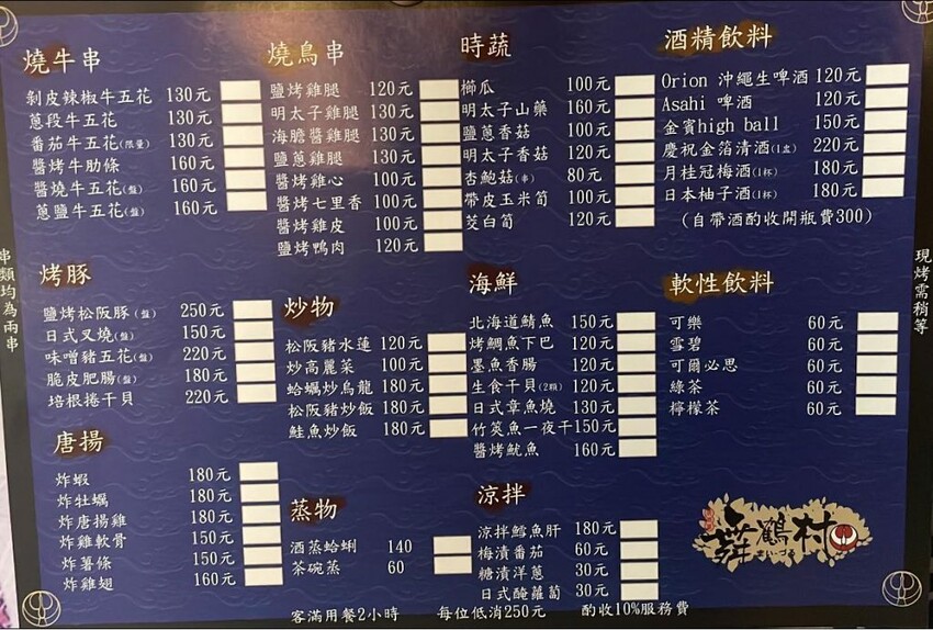 ▼【舞鶴村居酒屋】以現烤的日式串燒為主打,共有牛雞豚及海鮮可以挑選,另外也有涼拌、蒸煮、炸物、時蔬和炒物等,幾乎能想到的居酒屋常見料理通通有,用餐每位低消250元,中午時段則有供應定食,另外酌收10%服務費。