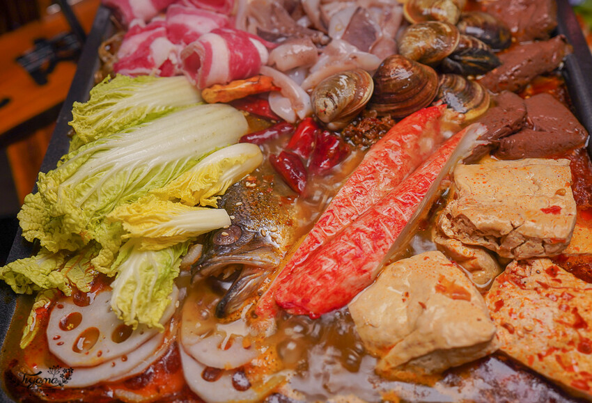 九宮格配料海鮮、肉片、青菜通通都有,有肉有魚有海鮮…放上麻辣烤魚整個菜色都豐富了起來。
