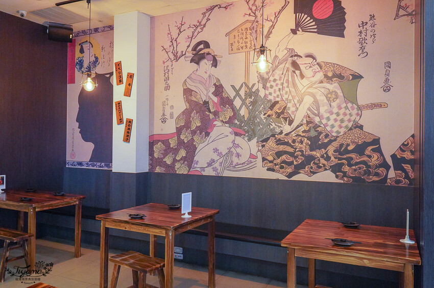 室內用餐環境也作了改造,牆面佈置日本浮世繪風畫與增添氣氛的燈籠,營造出日料餐廳與居酒屋的熱鬧氛圍。
