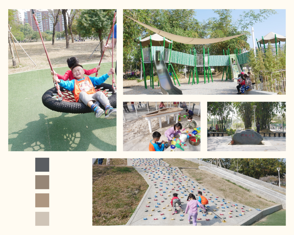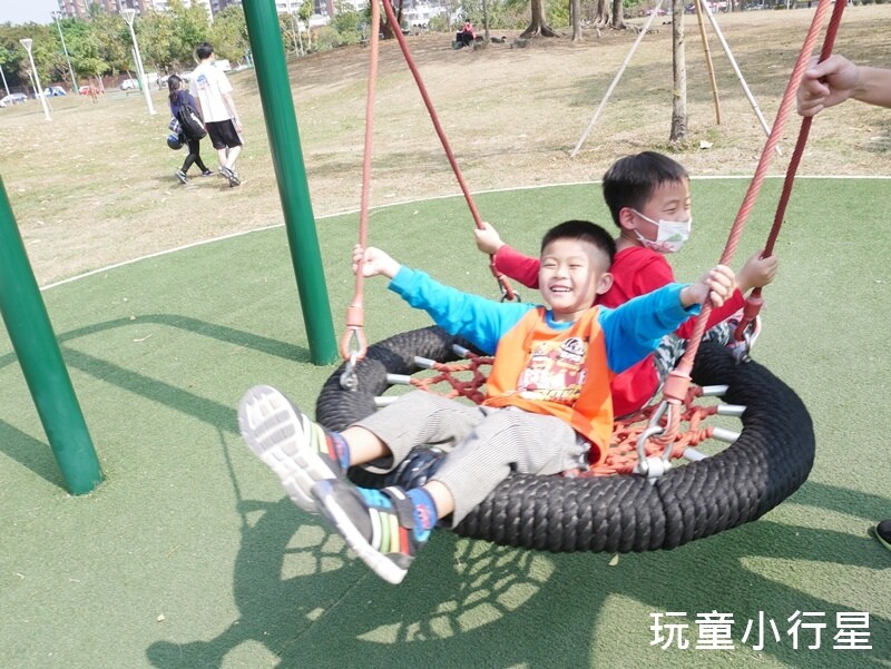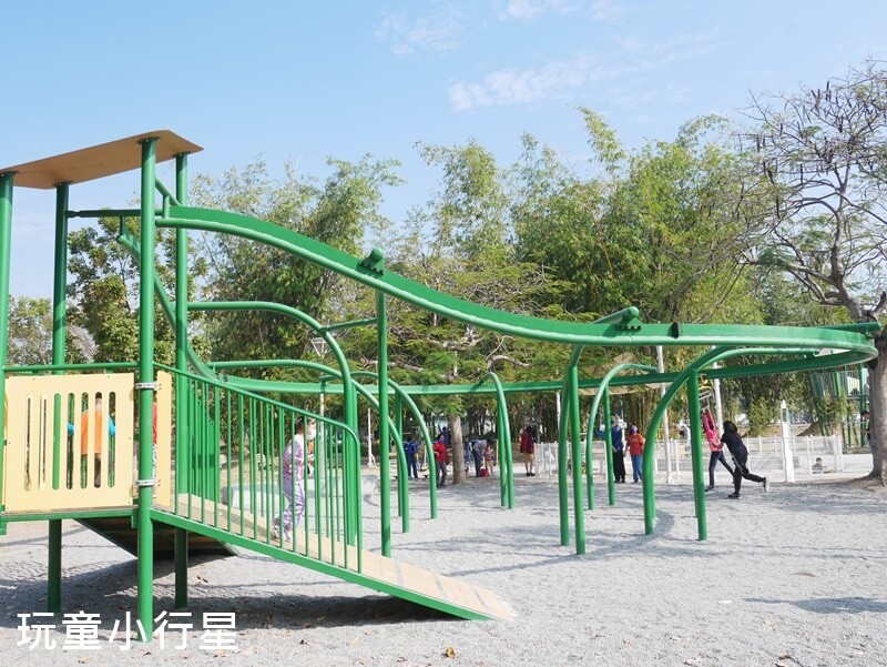 遊戲區有一整排的鞦千、攀岩坡、磨石滑梯、沙坑、跳格子、旋轉椅、溜索(用手抓住橫杆移動,非椅子式)