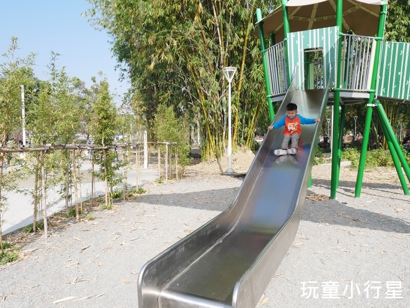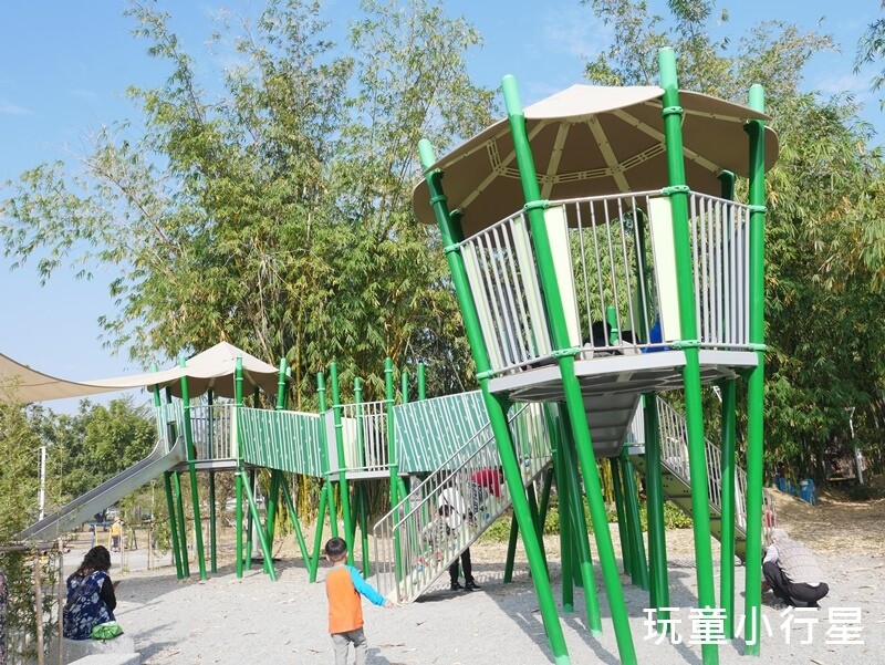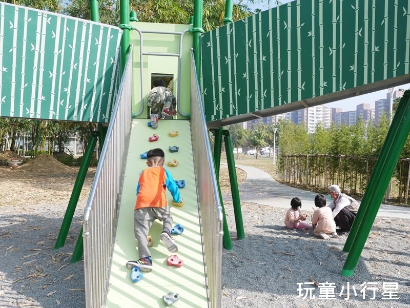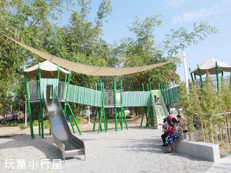 共融遊戲場以原有竹林為主題,相鄰竹林的竹子造型組合遊具相當吸引人。