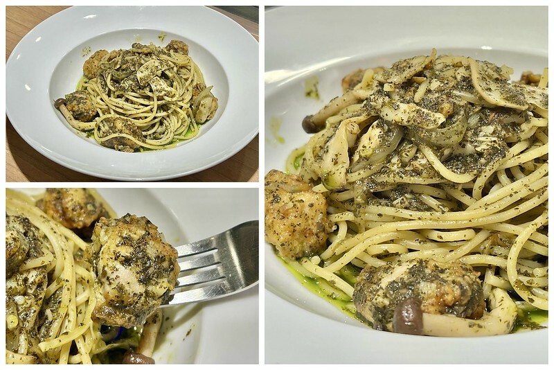 吃起來麵條香氣十足,蕈菇吸滿了醬汁的精華,每一口吃起來都很入味,麵條充滿青醬的香味,讓人相當喜歡~喜歡吃青醬的朋友來義窩瘋記得點喔~