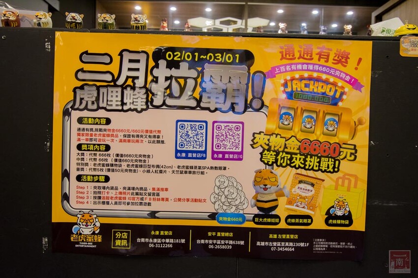 2月虎哩蜂拉霸!一起虎蜂拉霸趣,全部通通有獎,挑戰夾物金6660元、660元價值代幣、獨家限量老虎蜜蜂獎品,保證有得夾又有得拿!