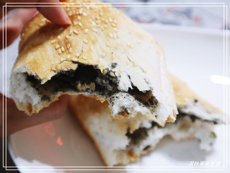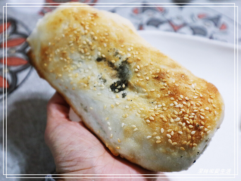 黑芝麻燒餅是看到有網友推薦,尺寸同樣不小,剝開後內層是濃密芝麻餡,微甜不膩口,吃起來香酥還不錯。