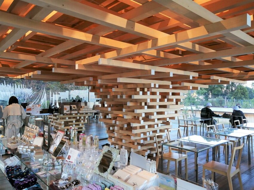 不過,最吸引的都在山頂上,首先是這家由隈研吾設計的咖啡廳COEDA HOUSE!四面是一大片落地玻璃,讓你在室內也可享受外面綠油油的景色,在中午時分溫暖的陽光灑進來,與隈研吾擅長的木材建築,營造一種和諧自然的氣氛。你可以在這裡買杯自家製香草茶及甜點來個下午茶,也可以逛逛手工雜貨。
