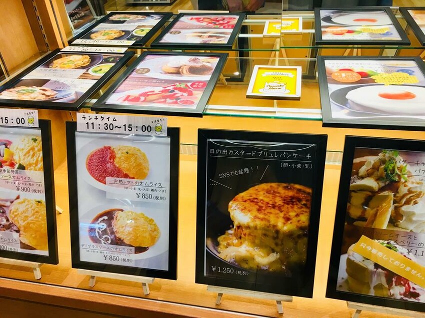 菜單選擇很多,甜點除了鬆餅還有刨冰及法式吐司,而午餐有蛋包飯、親子丼及雞蛋拌飯。這次我跟朋友選擇了日の出のプレミアムパンケーキ(日の出豪華鬆餅)及太陽蛋鬆餅(メダマヤーキ)。