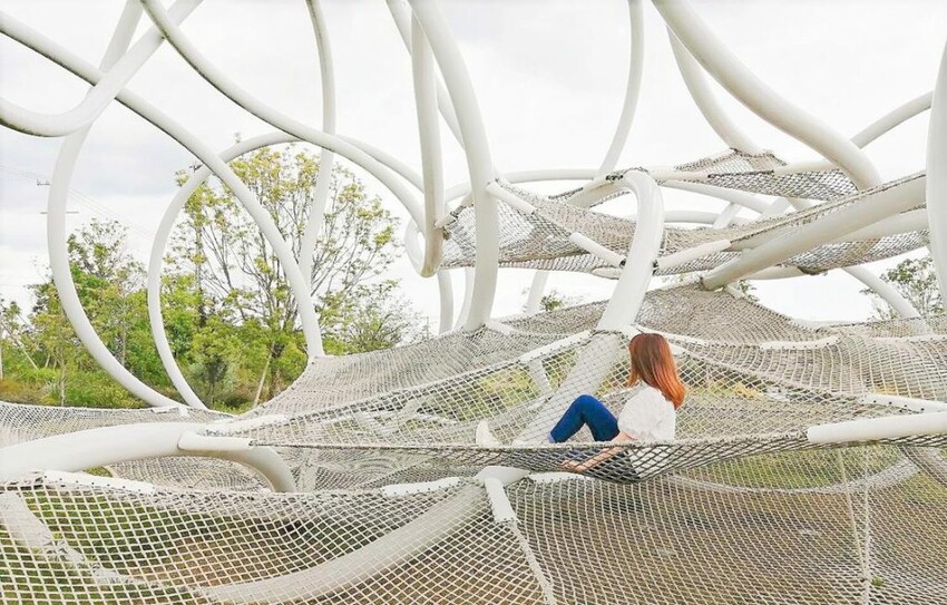 滿足了甜點胃後,中央有一個給小孩遊玩的區域,戶外還有一個巨大繩網!在平日的中午,這裡人流不多,所以我跟朋友就爬上去慢慢拍照,就算是大人也意外地覺得有趣,而且很好拍!天晴的話,白色的繩網跟藍天就是最佳的背景!這個甜點樂園雖然地方不大,有好吃的又好拍,非常適合女生喔!