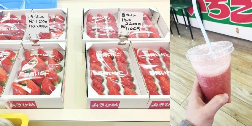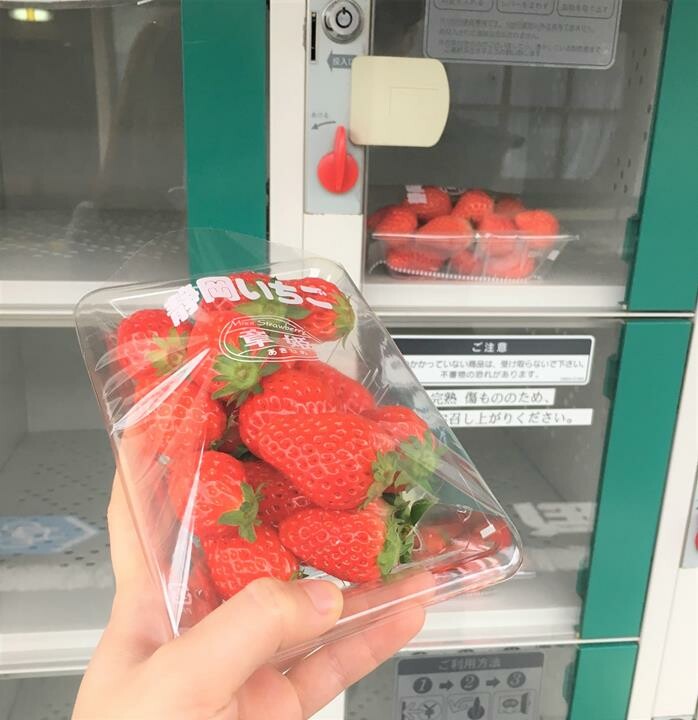 雖然新鮮又完好的草莓很棒,但價錢也是不輸東京的,反而一些少少損壞或過熟的很便宜,只要200多日幣就能買到一盒。我再告訴大家一個小秘訣,這附近有些水果投幣置物櫃,一盒完好的草莓只要300日幣!!不過置物櫃的位置比較隱藏,而且數量有限,大家可以試著去找一下!