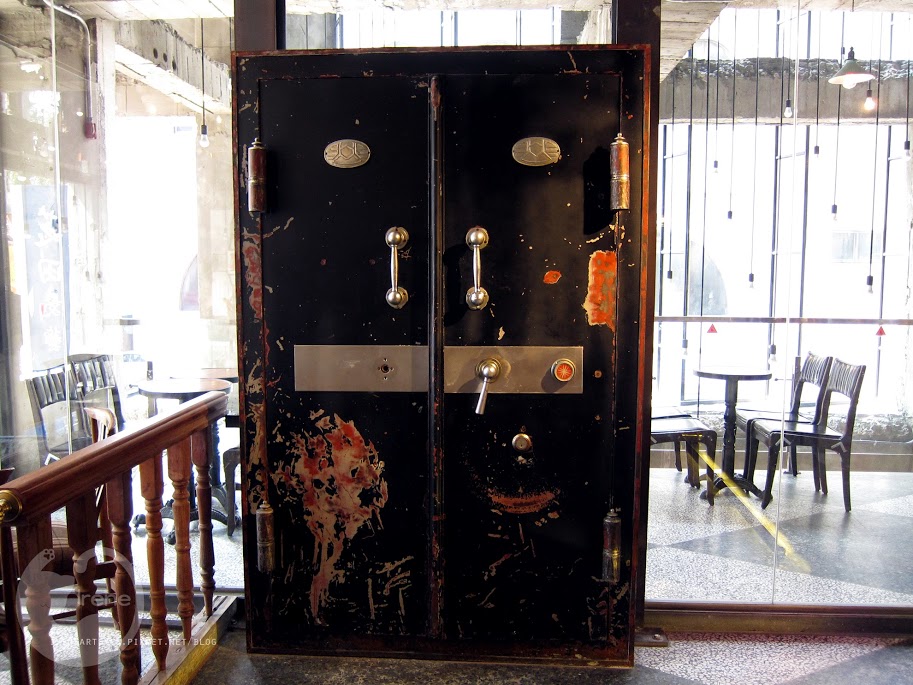 旁邊的落地格子窗外有一個超大金庫門!可千萬不要以為這個是大門哦!