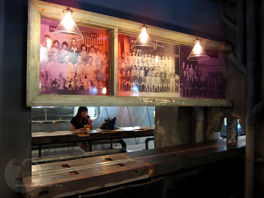 另一邊的座位很有趣,有著舊木塊和金屬管的長型桌組,配合吊燈的款式和藍色的間接光源讓人覺得有點工業風,