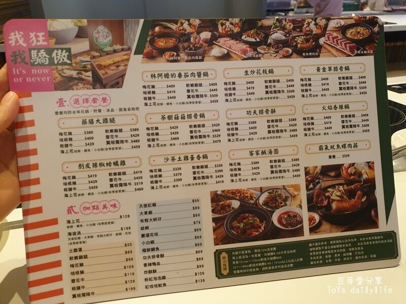 這邊有標示各個鍋的價格,每種鍋都有不同種類的肉品可以選擇,也有另外加點的部分。