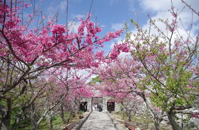 今歸仁城是日本100名城之一,也是沖繩北部琉球王國的世界遺產,同時也與「八重岳」、「名護中央公園」並列沖繩三大賞櫻名所。櫻花季來訪時,會配合花季舉行「今帰仁グスク桜まつり」,從城跡入口就能看見石頭步道兩旁盛開的粉色櫻花共譜的櫻花隧道,晚上步道會點燈,更將營業時間也將延長到晚上9點舉行限定的夜櫻活動。