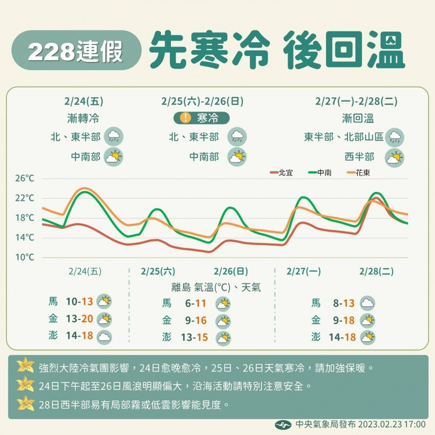 25、26日228連假前2天最冷,北台冷,其他他區早晚冷,台北測站約可降至13度或12度,即達「大陸冷氣團」或「強烈大陸冷氣團」的機率27日起強烈大陸冷氣團減弱,氣溫逐漸回升連假後2天(27、28日)及週三(3/1)冷空氣減弱,氣溫逐日回升大台北也轉乾,西半部晴朗、東半部偶有局部短暫雨的機率
