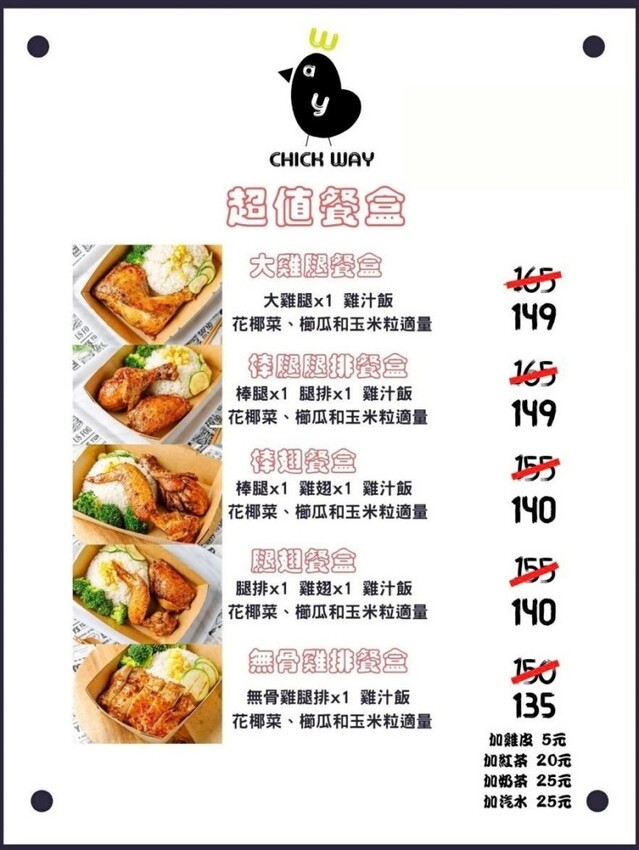 Chick Way菜單-主餐、分享餐、飲料、點心系列