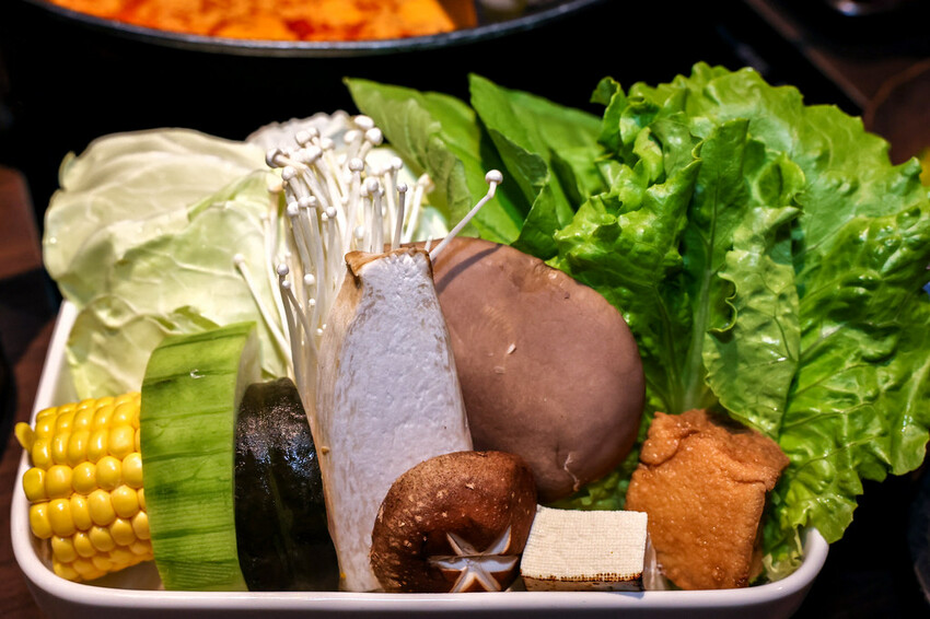有手工豆腐、玉米、杏鮑菇、豆腐、絲瓜等時蔬。