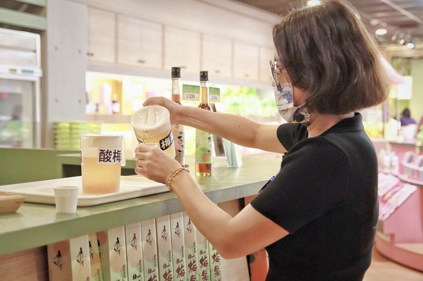 最後當然就會走到梅問屋梅子元氣館這觀光工廠的主軸-賣場!販售著許多樣式、口味、有籽無子包裝的梅子產品,大部分的品項也有提供試吃試喝,一旁的小吧台就有酸梅湯跟梅果醋可試喝,Ann則是試喝後看到他們有販售日本梅酒產品,就決定要買一杯來小酌一下(認識我們夫妻倆的朋友都知道我們很愛喝!)