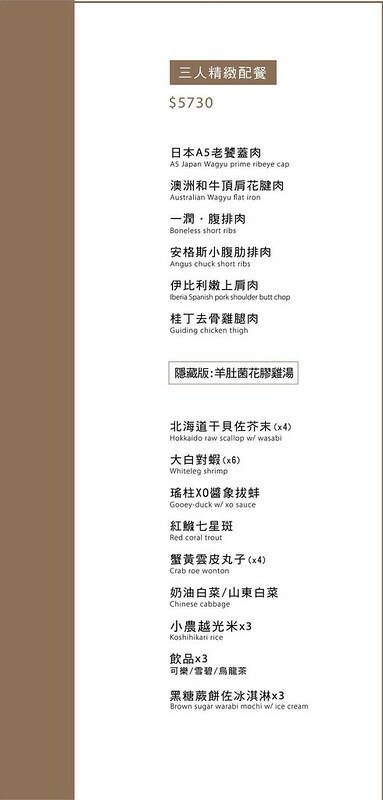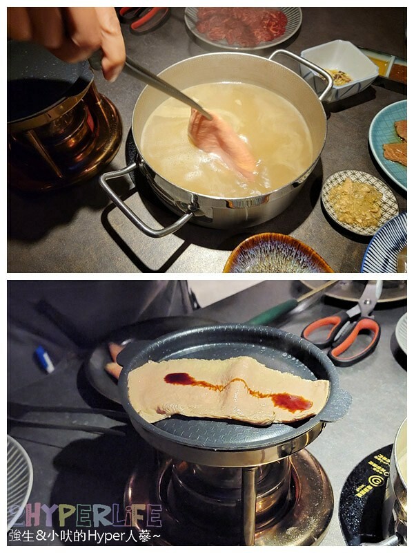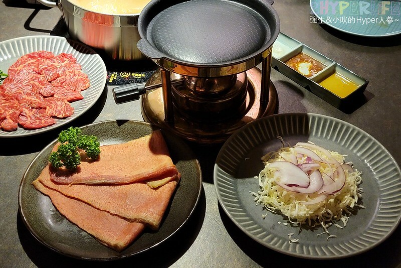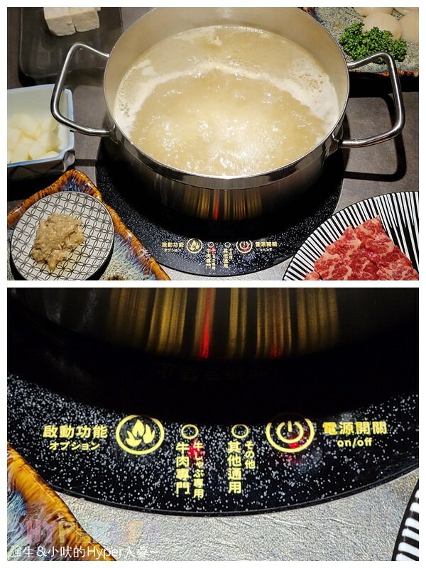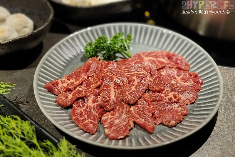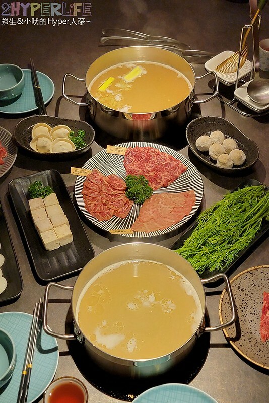 先來說一下,菜單內還有選擇兩種湯頭。一種就是前面比較小鍋的,服務生介紹這鍋湯底是固定的精燉牛骨湯,可以拿來專門涮牛肉。而後面稍微比較大鍋的,可以自己選擇湯頭,我們選的是黃金野山椒湯,口味上稍微偏小辣一些。是可以拿來烹飪豬肉、青菜豆腐、海鮮、肉丸等其他料理。為了就是讓牛肉涮起來是牛肉原來的甜美,而不會混合其他食材的氣味。真的是很用心才想出來的吃火鍋方式呀!