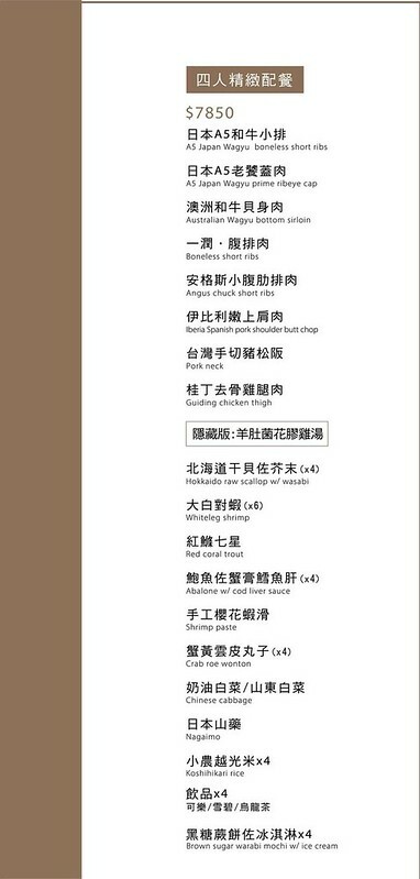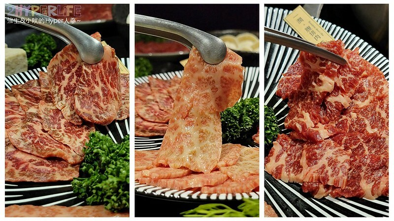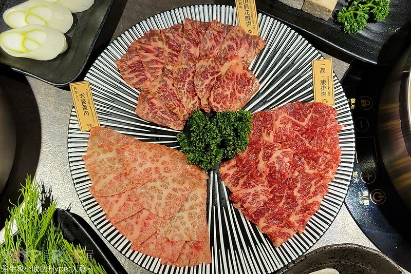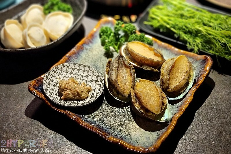 右下的一潤腹排肉,就是一開始有兩片demo的肉品(圖片右邊)厚薄的比例是恰當的,個人蠻喜歡選擇大蔥一起入口軟嫩好吃,而照片上方的澳洲和牛頂肩花腱肉口感吃起來蠻Q彈,蠻喜歡他的size 一口入剛剛好,但如果和腹排肉比,油花又比較多了一些;左側的日本A五老饕蓋肉吃起來會有一種果凍的Q嫩感覺,油花的部分會比其他兩種肉還多。可以擺在這盤的最後再享用,比較不會膩口