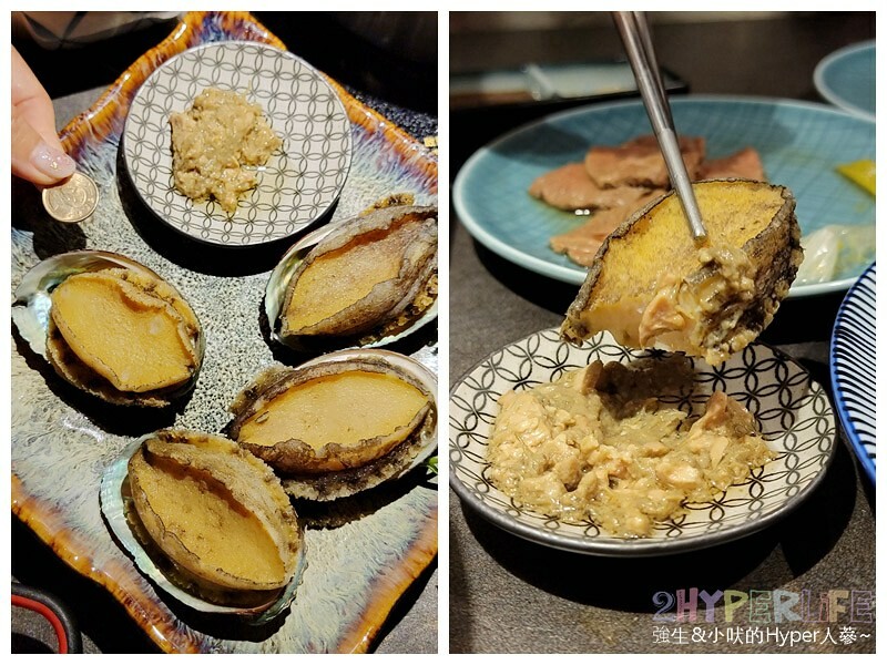 鮑魚真的不是普通的大呀,用一個一元硬幣當比例尺讓各位捧油看看!而一旁的蟹膏鱈魚肝醬有著濃濃海味,喜歡濃郁的感覺可以搭配著吃囉~