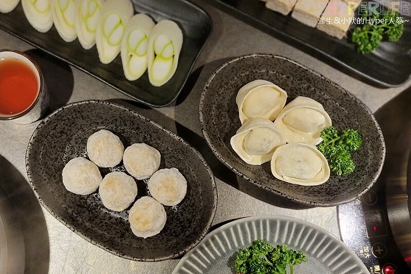 左邊的丸子是和牛丸呀!滾了之後在上面繼續飄1分鐘,就可以享用和牛牛肉丸,吃起來不會太油膩,有淡淡的牛肉味,會稍微比一般的貢丸油脂還多一點,新鮮和牛製作肉質非常Q彈;右邊那盤我們覺得真的很厲害,裡面內層有先炸過,然後外面再包一層皮整體非常好吃,不油膩可以聞的到淡淡的蟹黃香氣,然後裡面特別的是也有包荸薺增加脆脆的口感