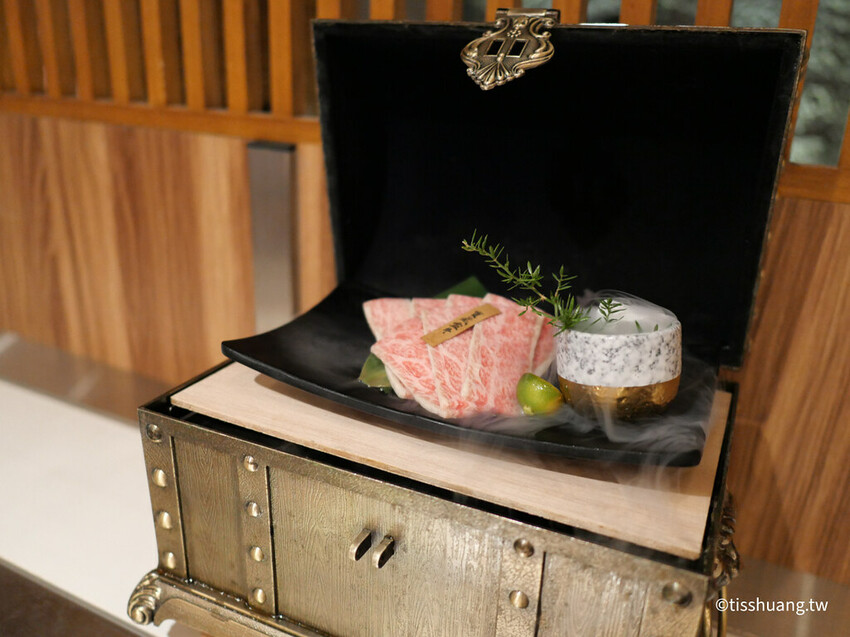重頭戲寶藏和牛上桌,不僅有輸送帶送上桌,還有乾冰會噴出來,真的是效果十足