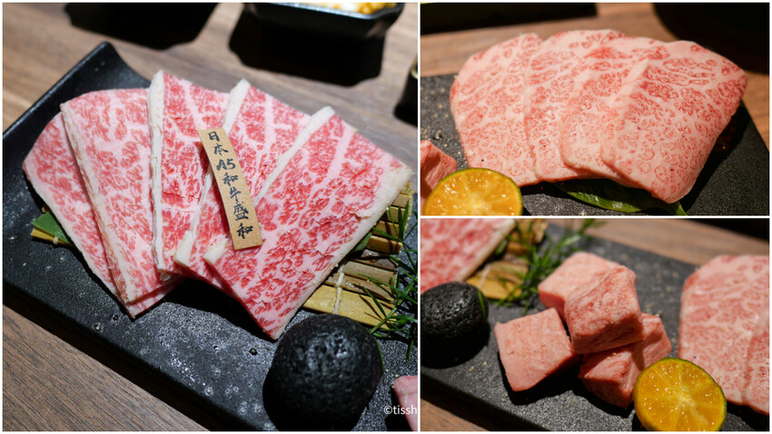 日本A5和牛盛和包括日本A5和牛雪花、日本和牛角切、日本和牛三角,日本和牛的肉質油脂真的很豐富,每次吃日本牛肉都會被油脂的鮮度、甜度驚豔,札卡燒肉的肉質讓我回想起在名古屋高山市吃到的飛驒和牛,油脂多到會噴出來那種,A5和牛盛和份量不多,每片都很珍貴,入口即化的感覺,讓人回味無窮