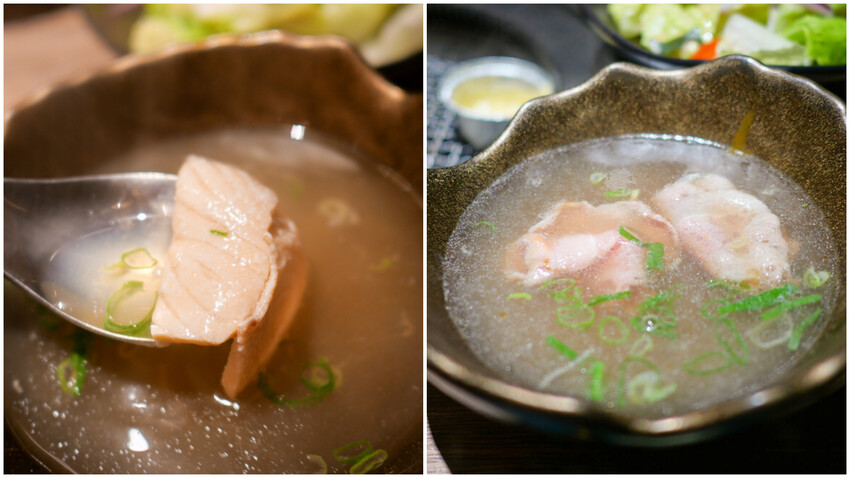 札卡燒肉所有送餐的方式都以輸送帶的方式送到座位上,有點像在吃迴轉壽司的感覺,第一批送上來的菜色是:主廚泡菜、伊比利豬湯、挪威鮭魚湯、主廚沙拉