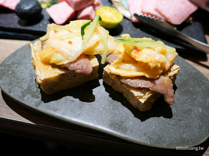第一次看到這麼特別的組合,臭豆腐上面不只有和牛還有泡菜,咬下去還有一點點山葵的味道在裡面,搭配酥酥脆脆的臭豆腐非非常有火花