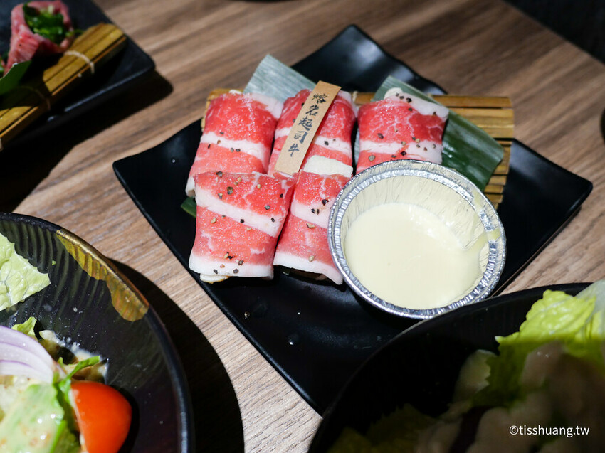 札卡燒肉有單點及套餐的價位,大家可以依照人數或喜愛的菜色去點餐,Tiss這次吃的是單點的菜色,包括:青蔥月見飯、甲羅蟹燒、蒜香奶油蛤蠣螃蟹鍋、炙燒和牛臭豆腐、明太子奶油烏龍麵、寶藏和牛、泰式生蠔、深海軟絲、頂級蝦菇