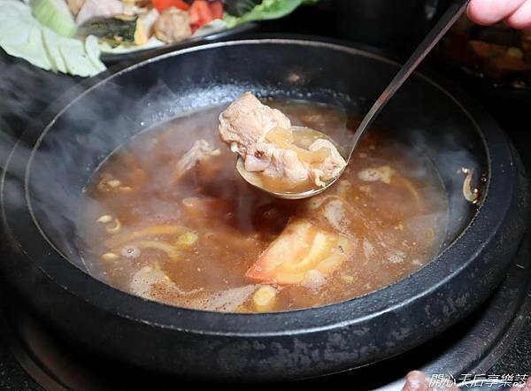 店員桌邊現炒爆炒招牌石頭湯,散發陣陣誘人香氣