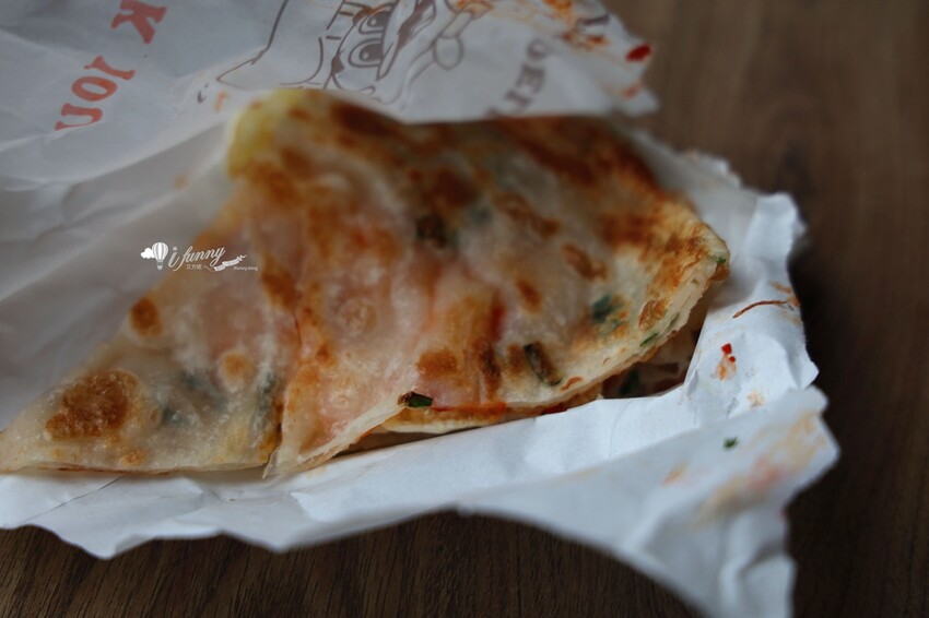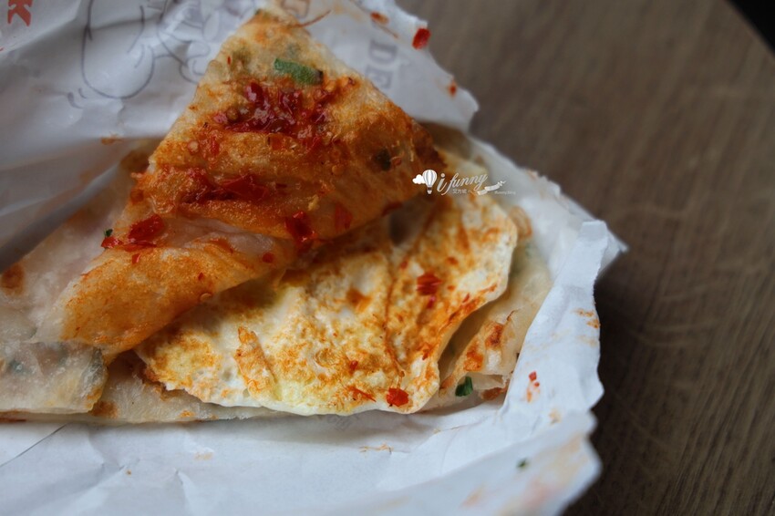 拿到熱騰騰的蔥油蛋餅時,可以感覺到蔥油餅的餅皮相當酥脆!近鼻就可以聞到蔥花的香氣,令人食慾大開!