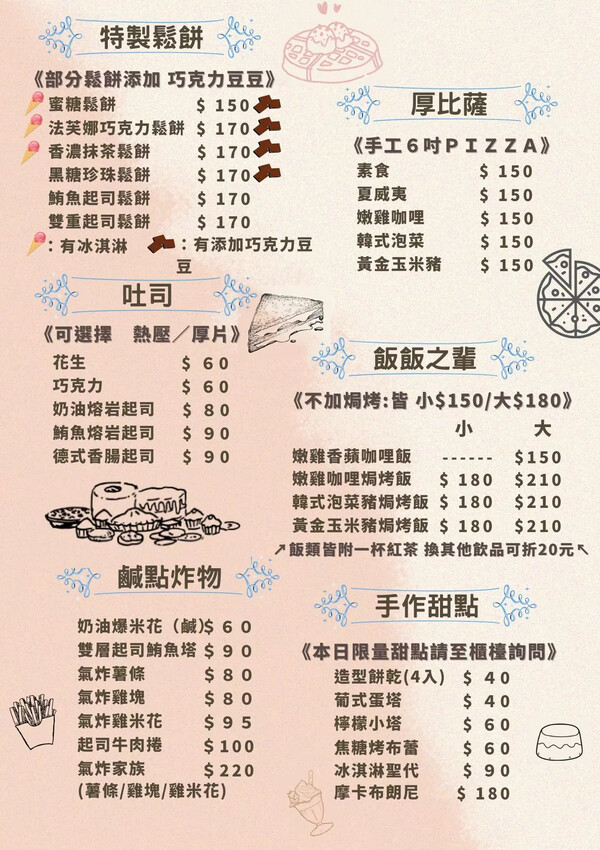 鬆餅、吐司、鹹點炸物、厚披薩、飯類和手作甜點(依現場實際供應為主)