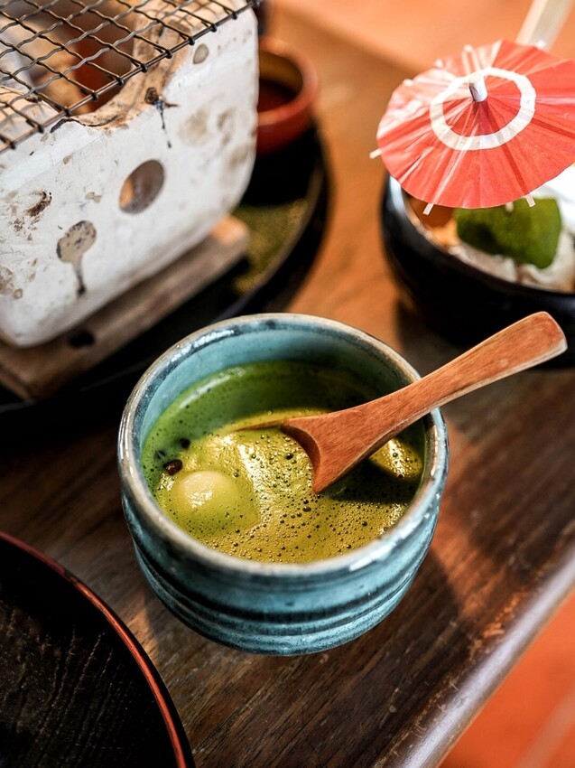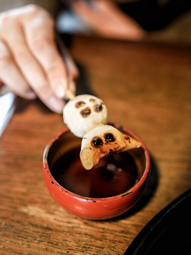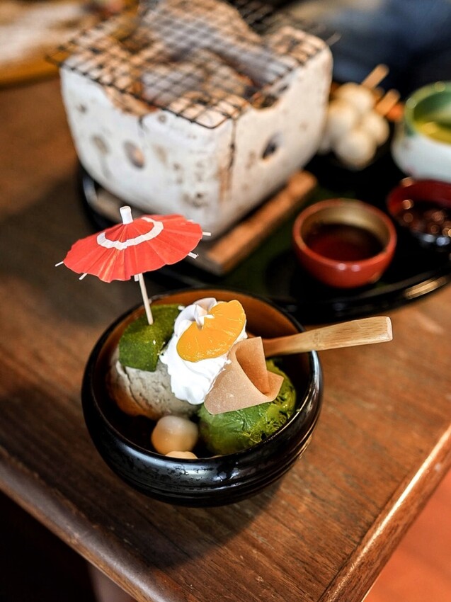 這天覺得值得一試的餐點是DIY烤糰子、天龍寺聖代和熱抹茶,糰子和外面買到的相去不遠,但可以自己動手烤得微焦再沾醬油或紅豆吃起來特別有趣;天龍寺聖代的抹茶和焙茶冰淇淋香氣都蠻不錯,特別的是加了京都特產生八橋作為配料;無糖熱抹茶則是寒風中的救贖,暖暖的配甜點剛剛好