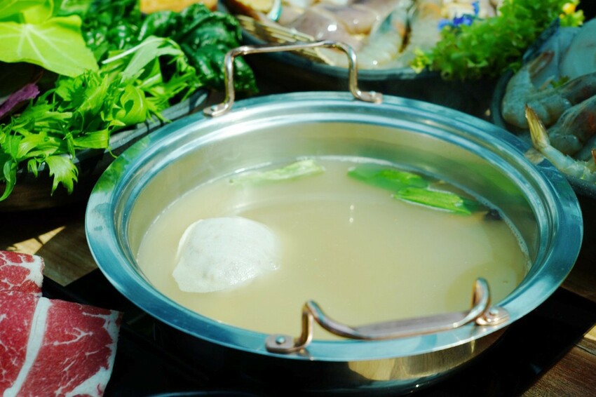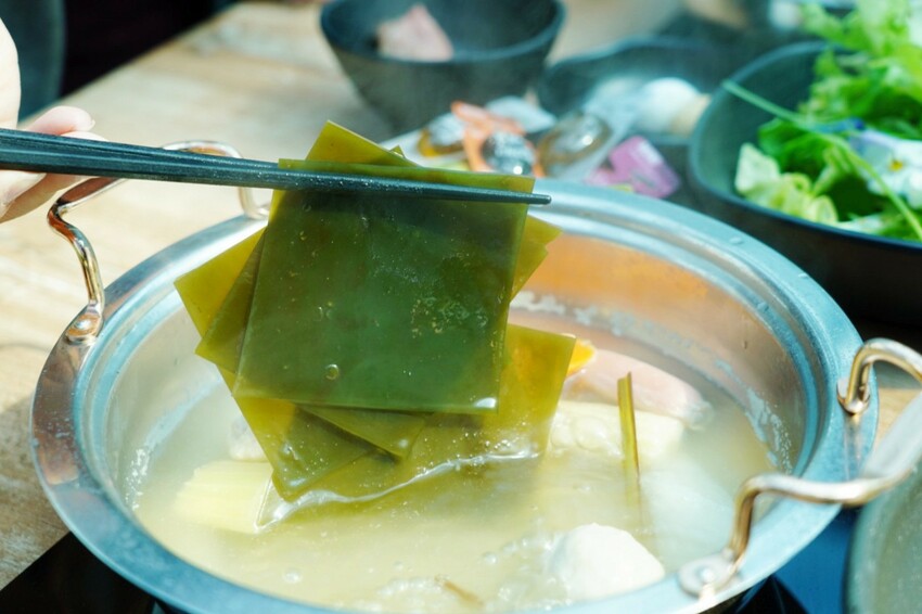 湯頭真實材料看得見!使用日本韓國昆布、芹菜、紅白蘿蔔蔬菜,為了引出甜味來加入甘蔗熬煮,不用加任何添加調味劑,湯底就很自然清甜,除了清爽不油膩,比我想像中濃郁,涮煮蔬菜、海鮮肉品什麼都適合。