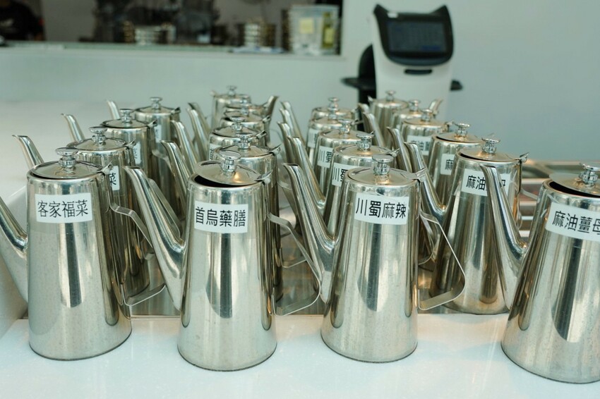 排列整齊的湯壺貼有湯底口味。