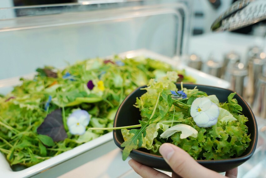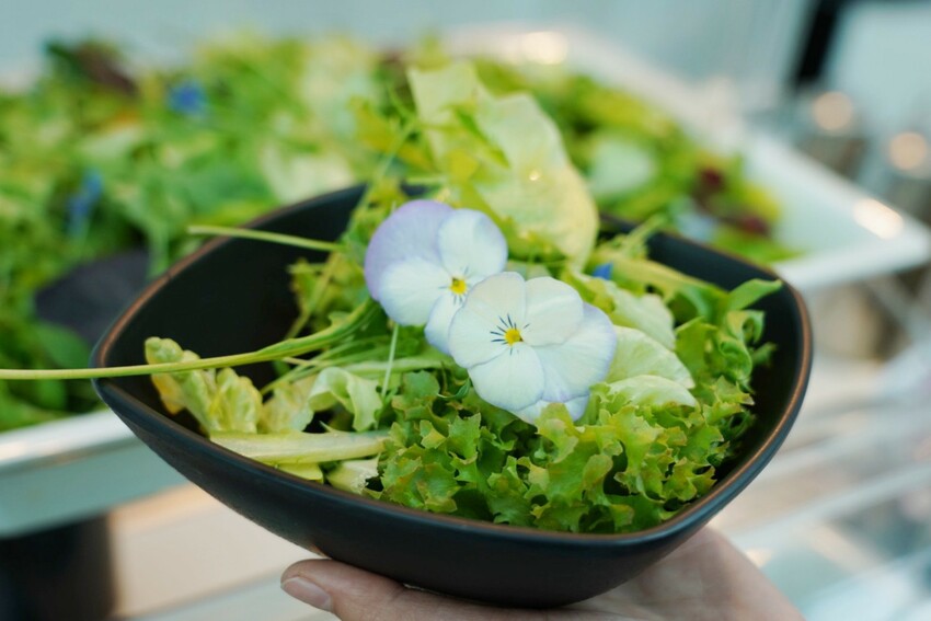 這的生菜沙拉好不真實!無毒水耕蔬菜加上食用花卉點綴,真的是天然高顏值沙拉,琉璃苣食用花好漂亮,健康養生又賞心悅目,還能無限享用吃到飽~