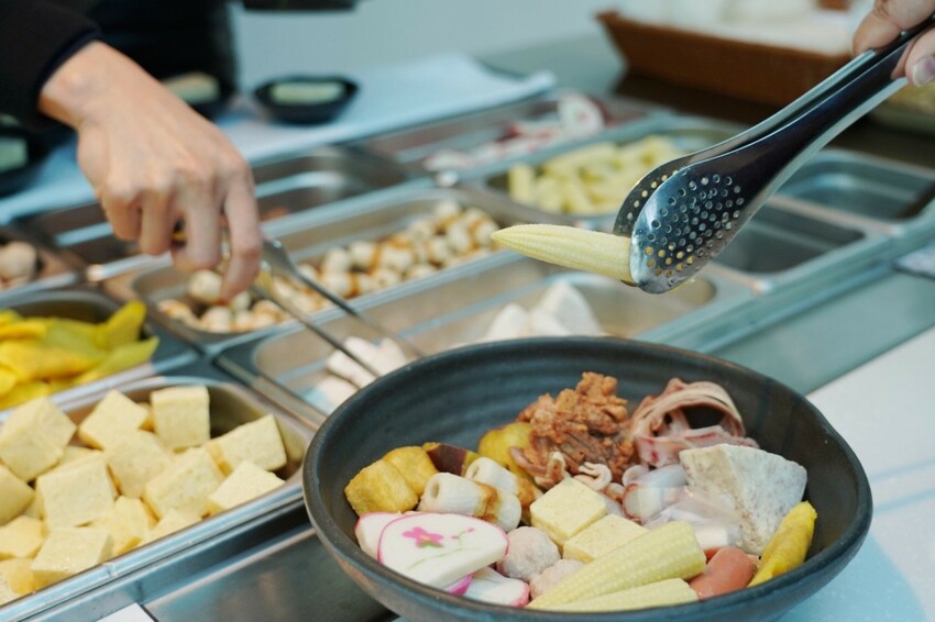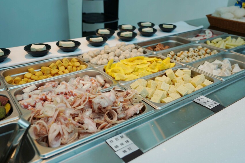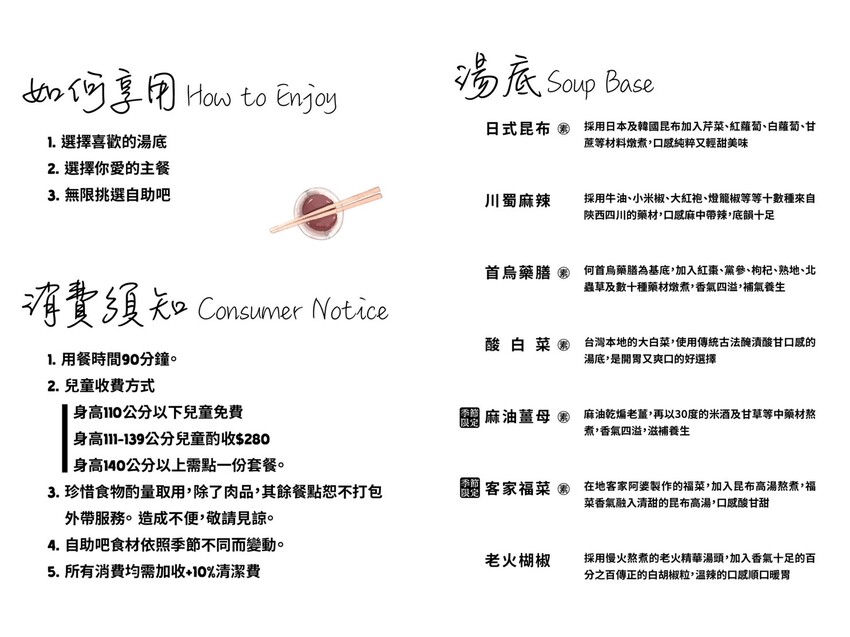 吃鍋物先選湯底接著選主餐,副餐都在後方自助區,隨你吃到飽!湯頭有日式昆布、川蜀麻辣、首烏藥膳、酸白菜、麻油薑母、客家福菜和老火胡椒七種可選,湯底有詳細介紹,麻油薑母和客家福菜都是季節限量~