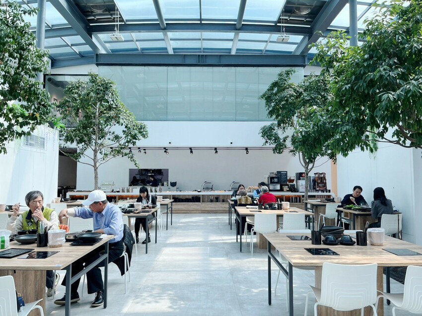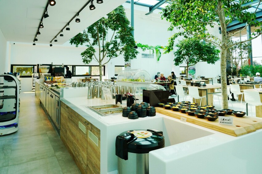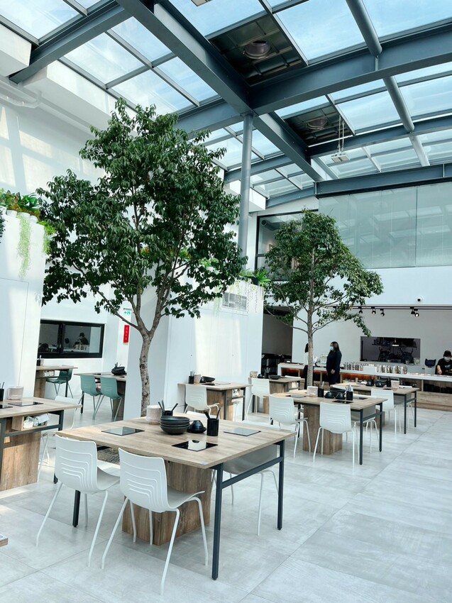 用餐環境挑高、寬敞很舒適,主體以白色搭配木製桌,給人好清新的感覺,現場種植了6顆真樹!加上大量自然光照射,整個空間乾淨又明亮,坐在裡面好像溫室小花~