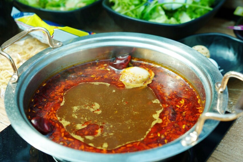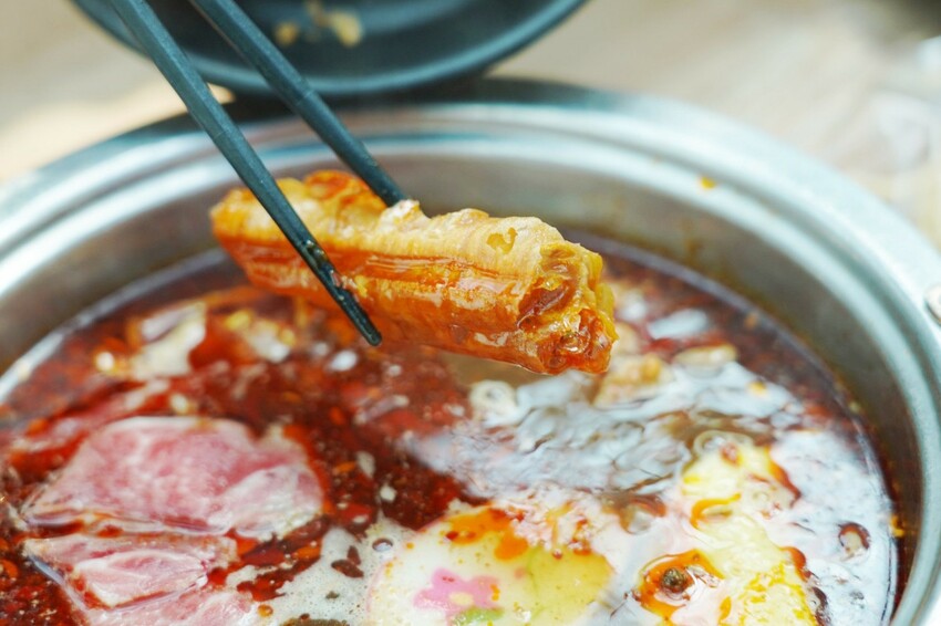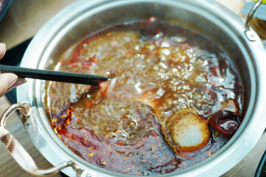 紅通通麻辣湯!特別選用陝西四川藥材,有小米椒、大紅袍、燈籠椒..等,直接喝起來不會過鹹,辛香麻辣有層次,喝多不上火,加入食材會越煮越鹹,覺得太鹹還能自己加昆布湯,調整自己想要的口味。