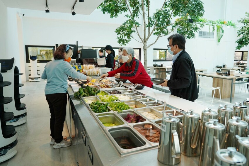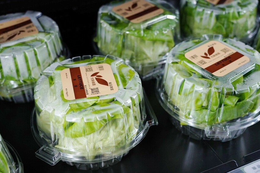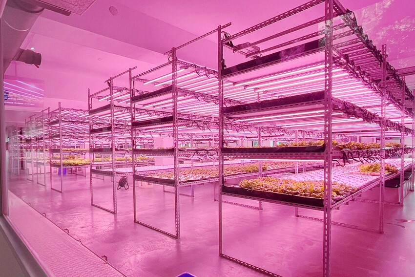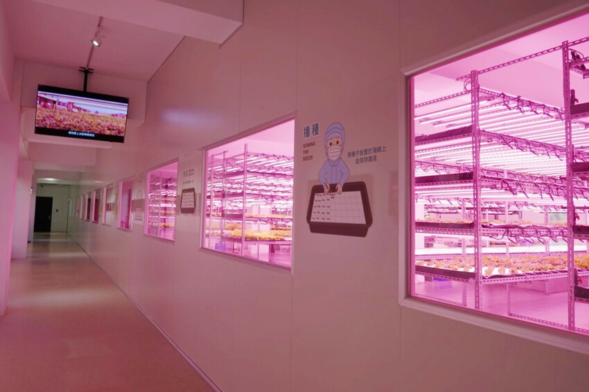 火鍋後方是無塵室種植,透過玻璃窗可看到無毒蔬菜,進入工作人員需全程穿著無塵衣,一排排水耕蔬菜,加上芬蘭進口植物燈,培育種植的蔬菜,不用經過水洗就能直接食用,無毒、健康又安全。