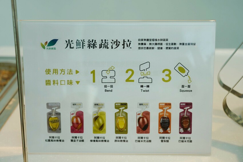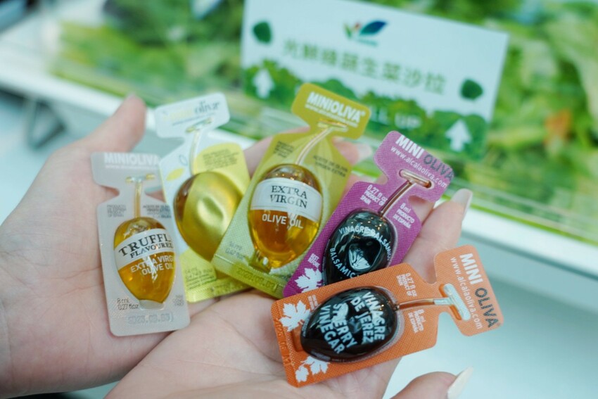 光鮮鮮蔬沙拉有七種油醋醬,都是西班牙原裝進口,初榨膠囊橄欖油好方便,有巴薩米克醋、覆盆子油醋、松露風味橄欖油、西班牙雪梨醋..等,小包裝方便攜帶,一次剛好一個膠囊,扭一扭轉一轉就能倒出來~